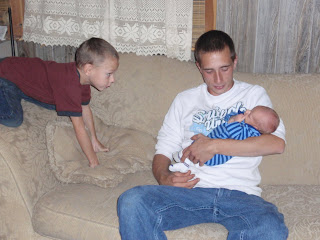 Cousin Jake checking out Evan Zander and Dad. When asked if he wanted to hold his cousin, he said I'm not holding that little rat!