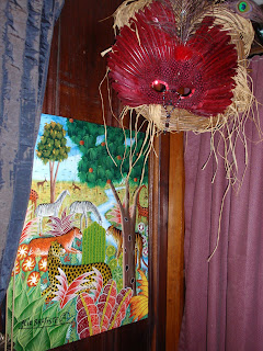 Now here is my weird corner, I have some more weird than others. This painting is by a wonderful artist, Alix Baptiste. I met him in Savannah, Georgia when I was visiting my friend Belinda. We were at Savannah Marketplace. Alix had many styles of paintings. I like the primitive art of this one and all the bright colors. I did buy this new. The feather mask is attached to wreath with a magnetic necklace. Told you, weird!