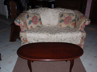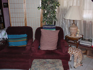 My sitting area in our bedroom, where I read, paint, write, or watch tv or just sit staring mindlessly into space. My spot...everyone needs one. I can invite people in or lock the door.The love seat is second hand, the coffee table a Mother's Day gift from Hubby years ago. The carpet is a scrap.