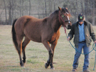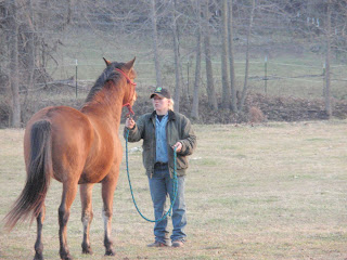 Time to go to Trainer Sam's where she can work her magic. We started almost too late in the afternoon, because unlike our Magic Man, Arrow was not interested in loading. He was interested in nothing but Mama.Sam tried food, loving, leading but Arrow was not going in that trailer. She ground worked him, led in in the field, still no prize.