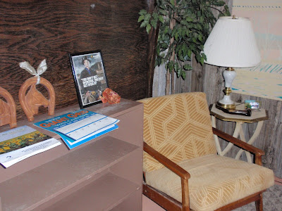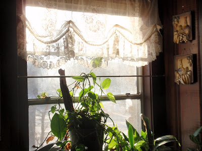Last but not least, the flower corner, where a few survive my brown thumb. The hangings to the right are Mom's. This window faces east so Bev placed a lacy curtain so the flowers would have all the advantage of the morning sun.