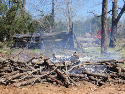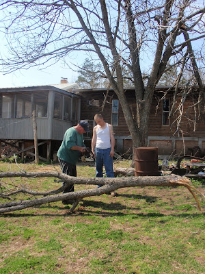 We got one big limb off the house without tearing anything up. Removed several limbs by the old house. Fire wood cut up, limbs burned and places cleaned...not many, but we made a big showing.