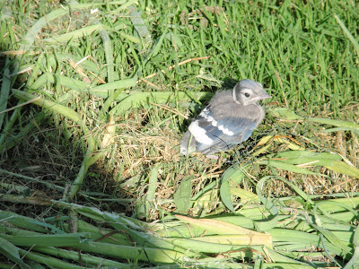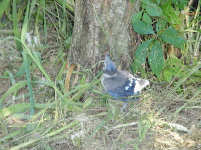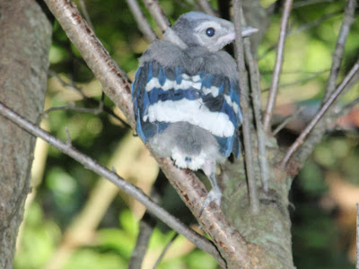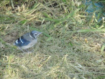 I heard a terrible noise! I ran to the door and could not imagine what that sound was. There was Squiggy with a baby Blue Jay with parents attacking. I yelled and Squiggy dropped the bird...no damage to the little guy.