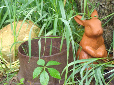 I found an old commode tank and thought what a lovely table! I must find the perfect top. I shall remove the wood cookies and as the bog bean grows out of the tank, I believe it will be the final touch. The bucket is my trash can.