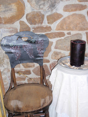 This table with the pine cones and sweet gum balls is one I made about four years ago with scraps I found in the old barn. The legs are cedar tree cuts. It is edged with worn uneven two by fours. The center is an old piece of bead board I cut to fit and interlocked them for the top. Rustic was the look I was going for and I think I made it.