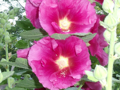 Beautiful, beautiful! The one you can't remember is "Dianthus", also called "Pinks" as mentioned in an earlier comment. I have some in bloom right now. Have never seen Double Hollyhocks before.