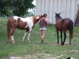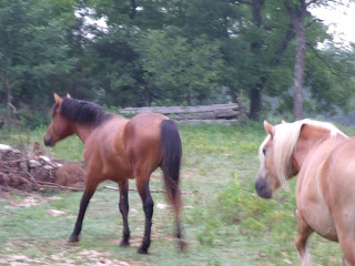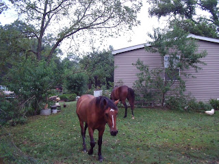 Marcy, my sister, noticed and pulls the mashed fence up and stops Charme and Magic from escaping. Marcy, quickly, lets me know. The horses use to graze the whole valley but the garden is in it's prime and many flowers would not withstand the dance of horse's hooves.