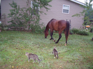 My boys can easily jump anything when they feel the need but thankfully they do not...often. This large step opportunity was too tempting to pass, so on about their grazing business in the freshly mowed, tender lawn grass.