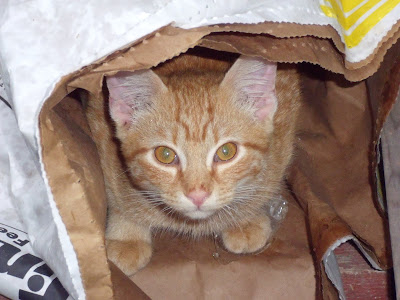 Pretty garden ornament and a cute little cat in the sack. I wish I had sacks like that handy. We only get plastic ones anymore. They are a threat to the environment. It's hopeless.