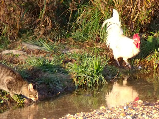 I like to see the pictures of the cat and chickens together. I especially like the one where they are both at the watering hole.