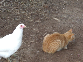 I just love seeing that chicken sneaking up on the cat! =) Great Capture Marcy!