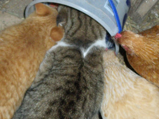 What the heck is in that bucket? There's a chicken with the kitties all interested in that bucket!