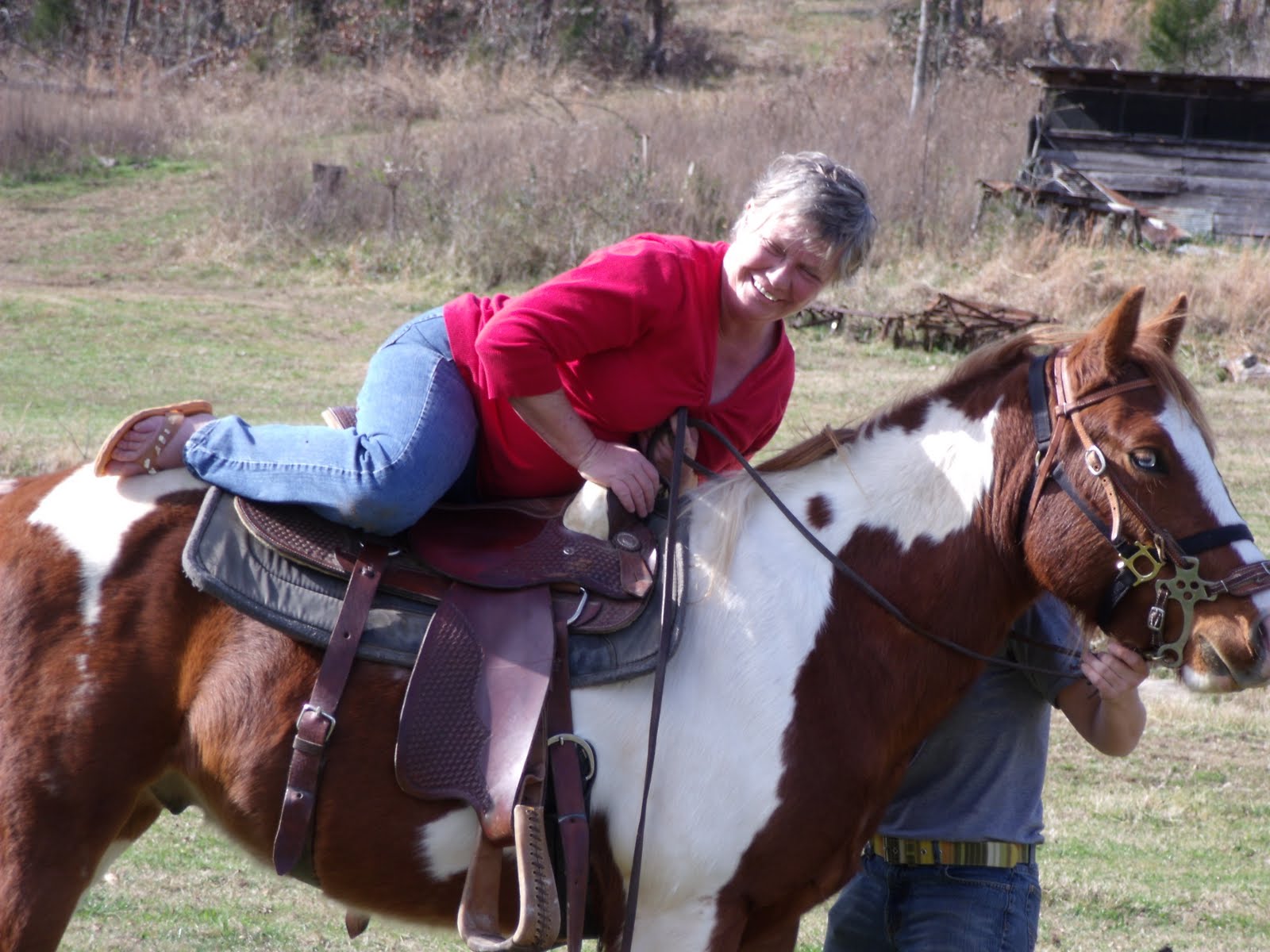 Sam helps Magic and Sam helps me. The stirrups are too long and guess what I have on my feet? Flip flops!