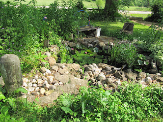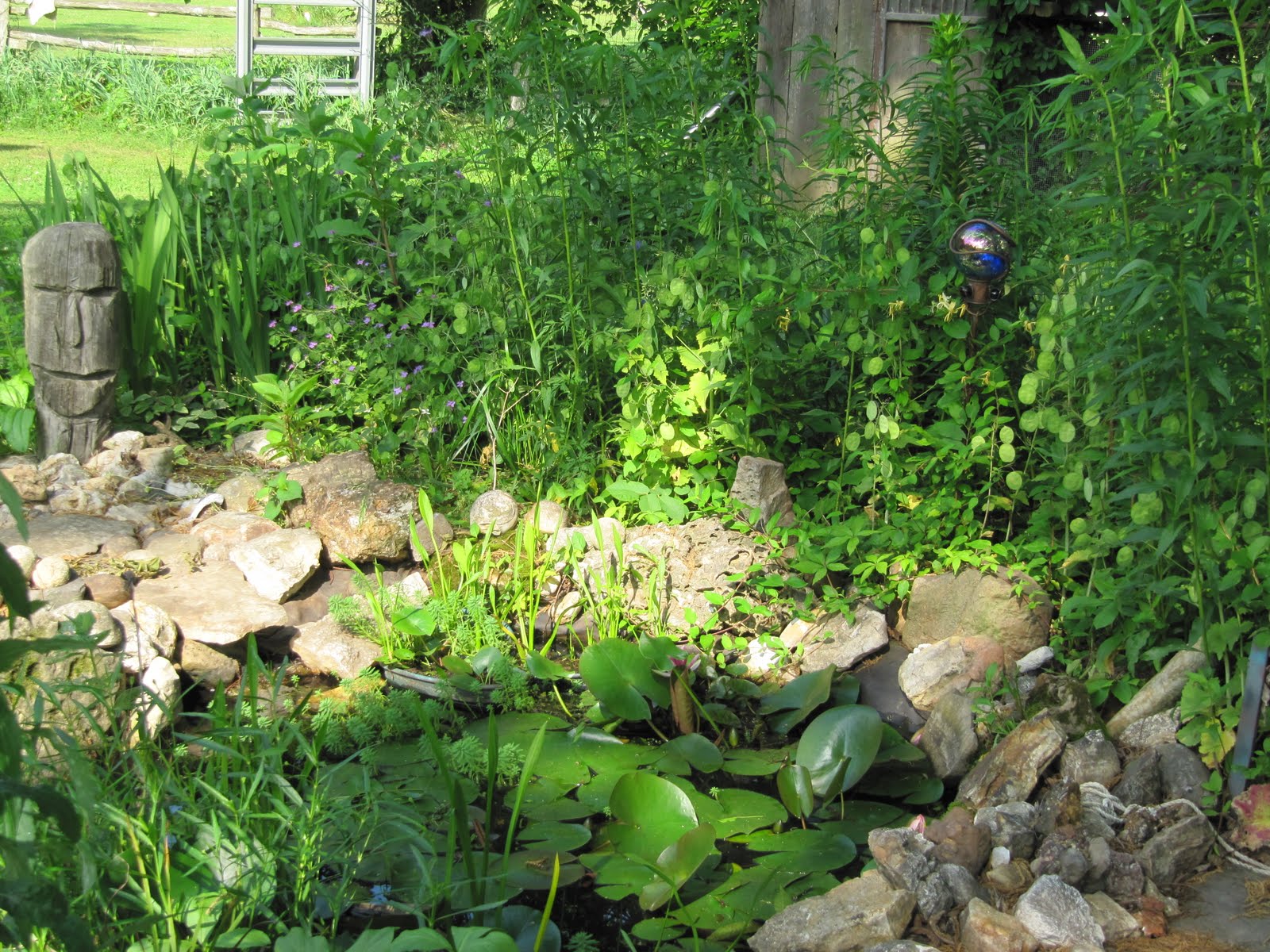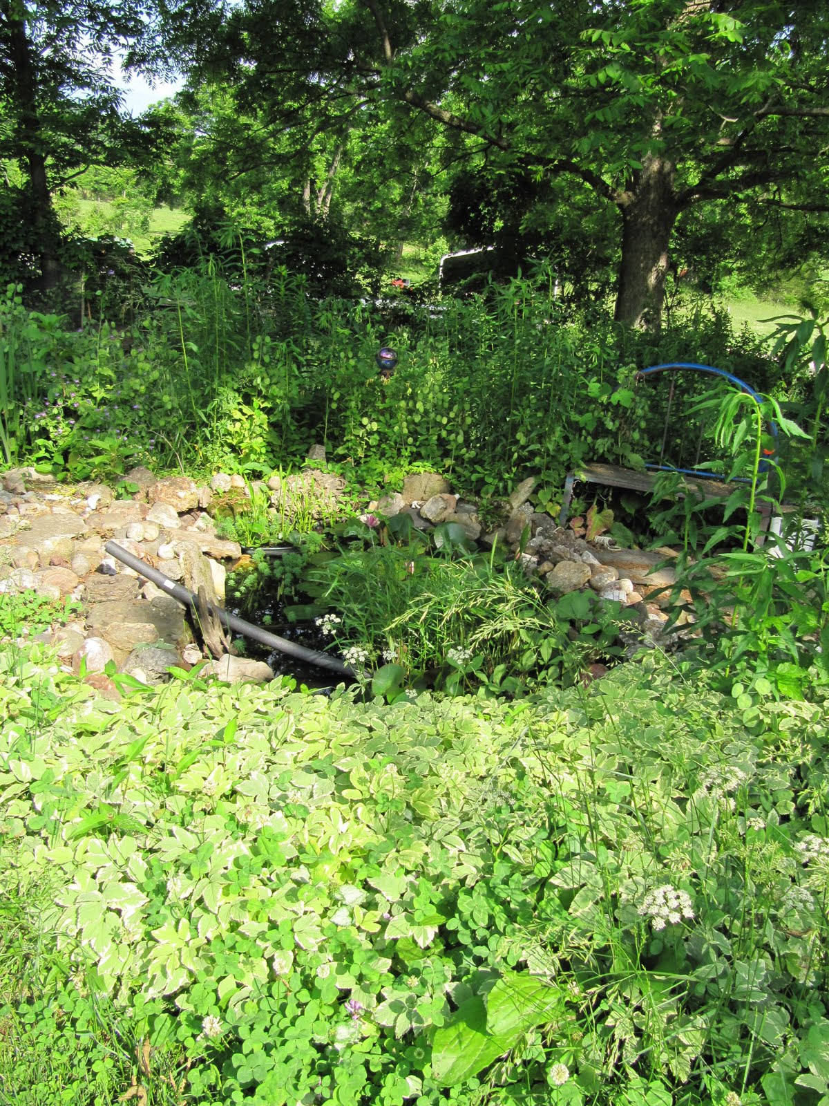 Hostas visible, lillies visible, rocks visible...just a mere few hours later. This was my resting spot on the log, I would sit and drink a tall cool drink as I pondered my next move.