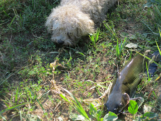 This is one that got away. Marcy reeled it close to the bank and they both had to rest after the battle, the fish and Marcy. Even after it slipped the hook, it lay and rested before it swam away.