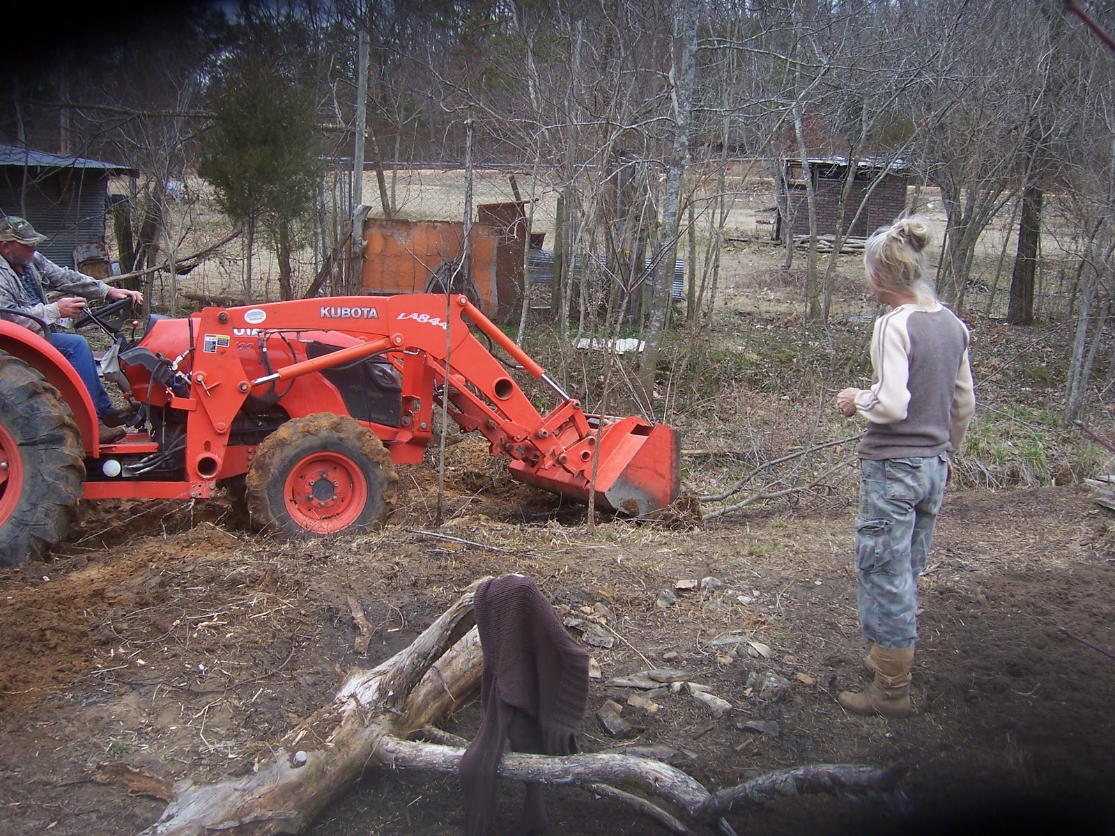 Bev is helping, supervising, then has to do all the hand work. Can you imagine how long it would take to clear this ditch with a shovel?