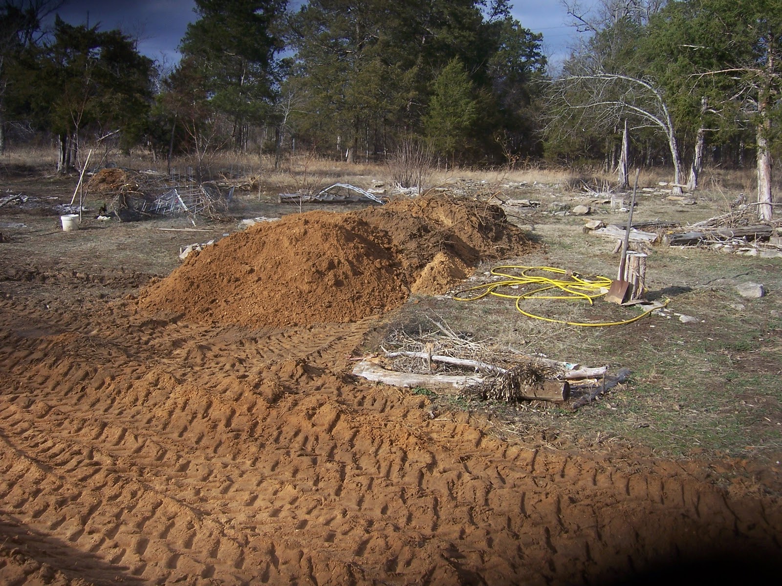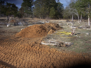 The bed of the dry creek is deepened, waiting to be reshaped by the next rain. The soil waits to be hauled where it is needed. I know this isn't beautiful but three short years ago, this entire spot was filled with tornado twisted trees and debris. It has come a long way toward being Marcy's beautiful back yard.