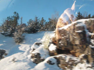 Oh, the pictures I COULD have taken if someone wasn't driving forty-eleven miles an hour! Here is my masterpiece, a blur outcropping of snow covered rocks with my hand and camera reflected in the frozen glass.