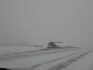 This is the same stretch of road, notice the combine. It has snowed all day and the only thing that saved us was the flakes were tiny and dry. We have around six inches and it's still snowing. I know, I know, that is not even enough snow to sneeze at but here, it is crippling.