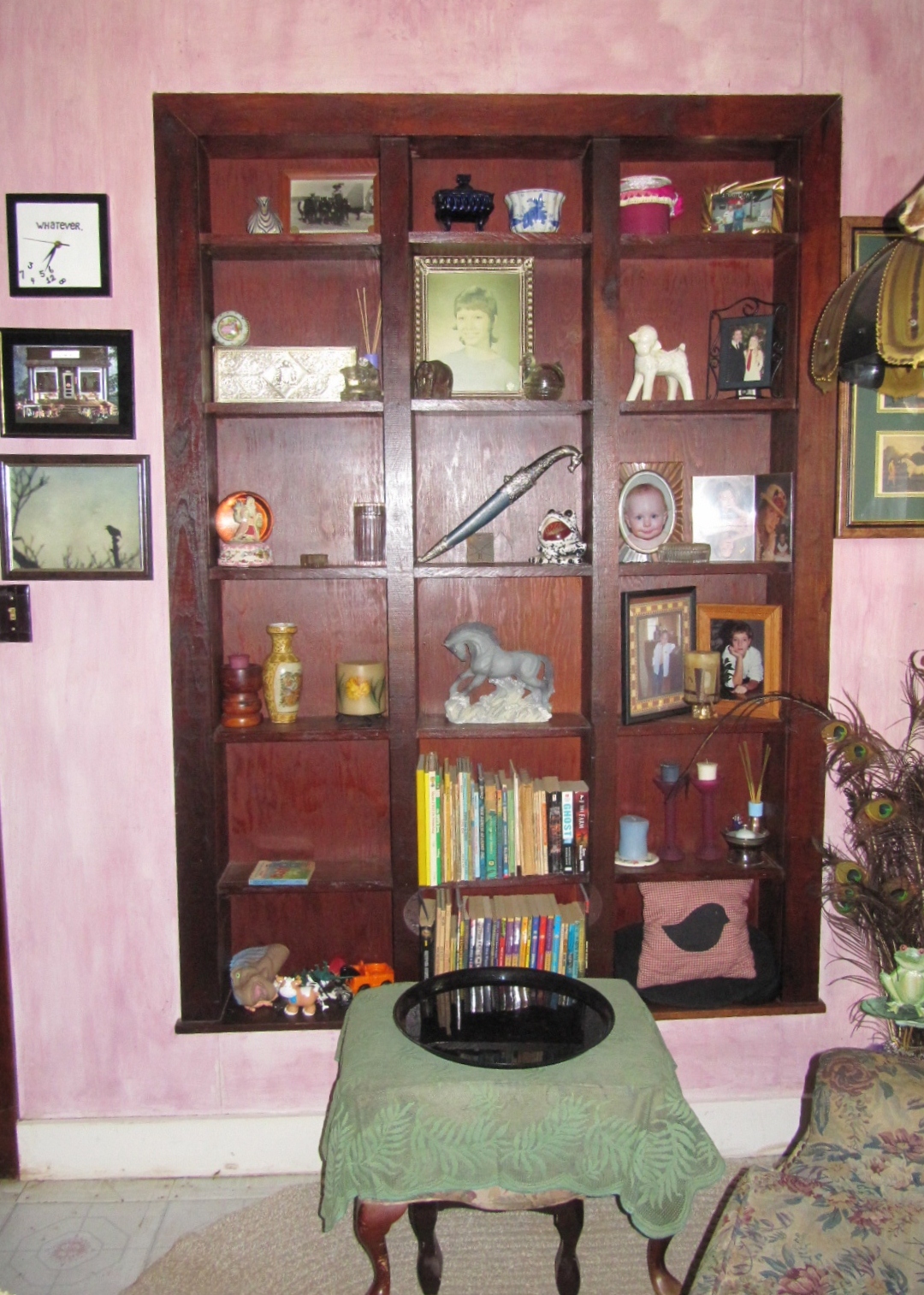 My me corner, complete with sweet tea and foot stool, to read, watch tv, write, or just to stare into space after a long day. All things important are only a arm's reach away in those drawers. To our left is a cedar table Dad made me, Aunt Evah's chair with a yard sale side table and lamp. The foot stool is the blob of flowered material in the foreground.Mom wanted lots of built-in shelves when they built this house so they remain. This shelf used to be stuffed with books but they have moved to the shop. Much more thinning is needed and that will come...maybe one truly favorite item per shelf. I read here with the natural light. Note the toy shelf! I also have a shelf for emergency candles for when the power dies, complete with lighter.