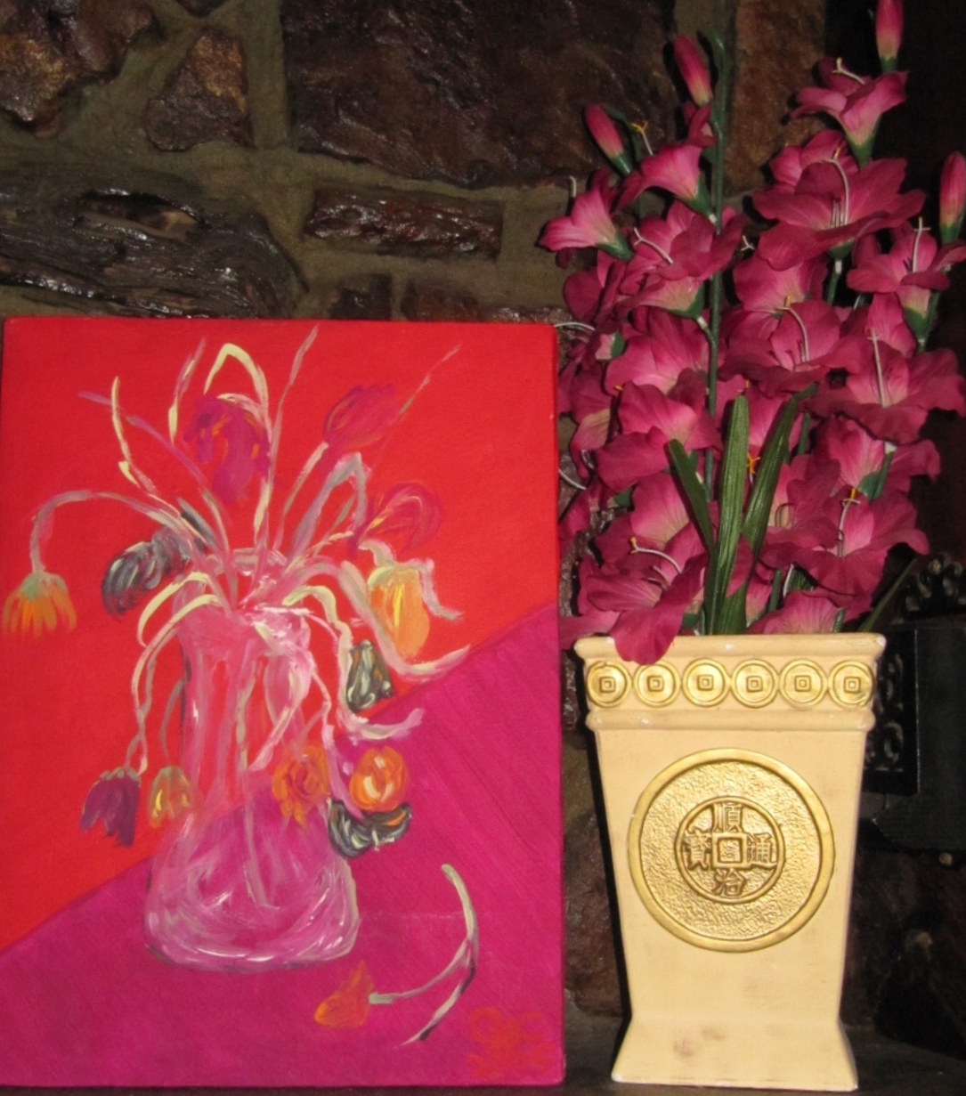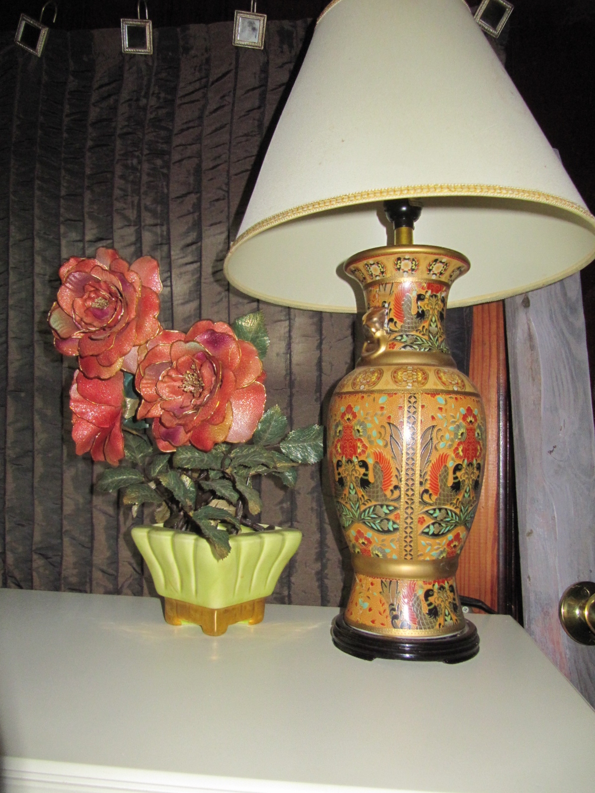 Yard sale bowl, cheap flowers and dollar store lamp,