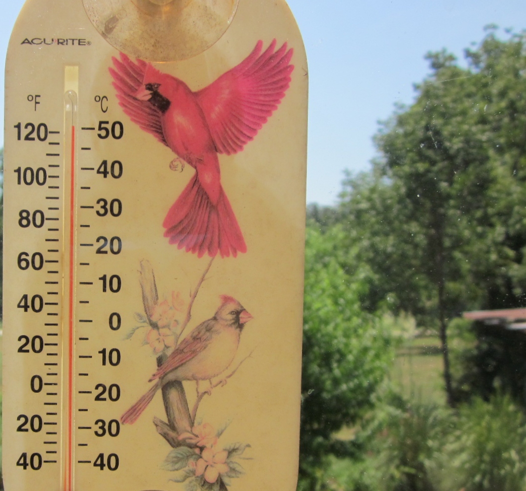By the looks of that temp, HOT is an understatement! Garden looks good though. I was just too lazy to even get one started this year and now I regret that decision...ah well...live and learn.
