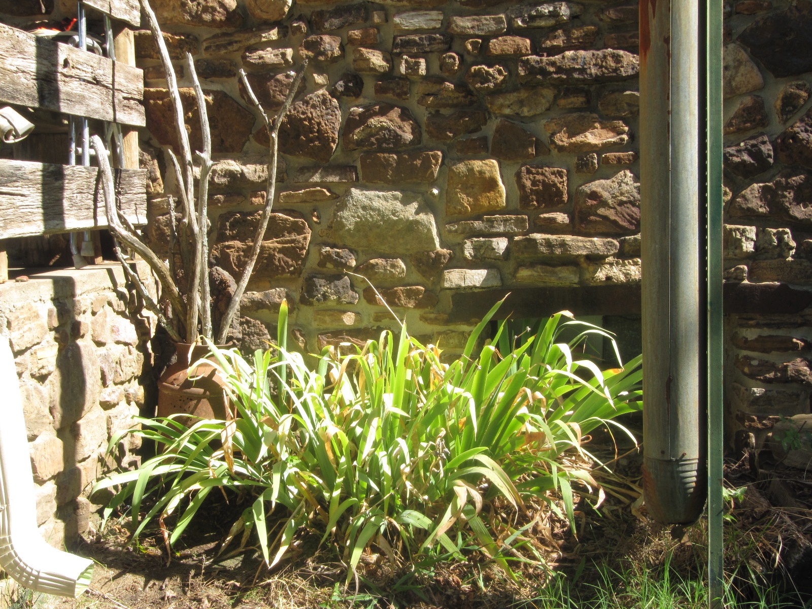 What a lovely area. I especially love the rock walls. You could use some spray paint made for BBQ grills to pain a camouflage design on the pipe. Maybe something that would blend in with the rock wall. Glad you saw the wasp before it got a chance to sting you. I'm not allergic to them but sure don't like them.