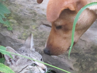 How sweet....My daughter has 2 dogs and three cats. They all live INDOORS. Mostly they get along, except when her big male cat, Khan, decides to get in a snit and hiss at the dogs when they walk by. He can scare Atlas, a 60 pound dog into submission. It's amazing.