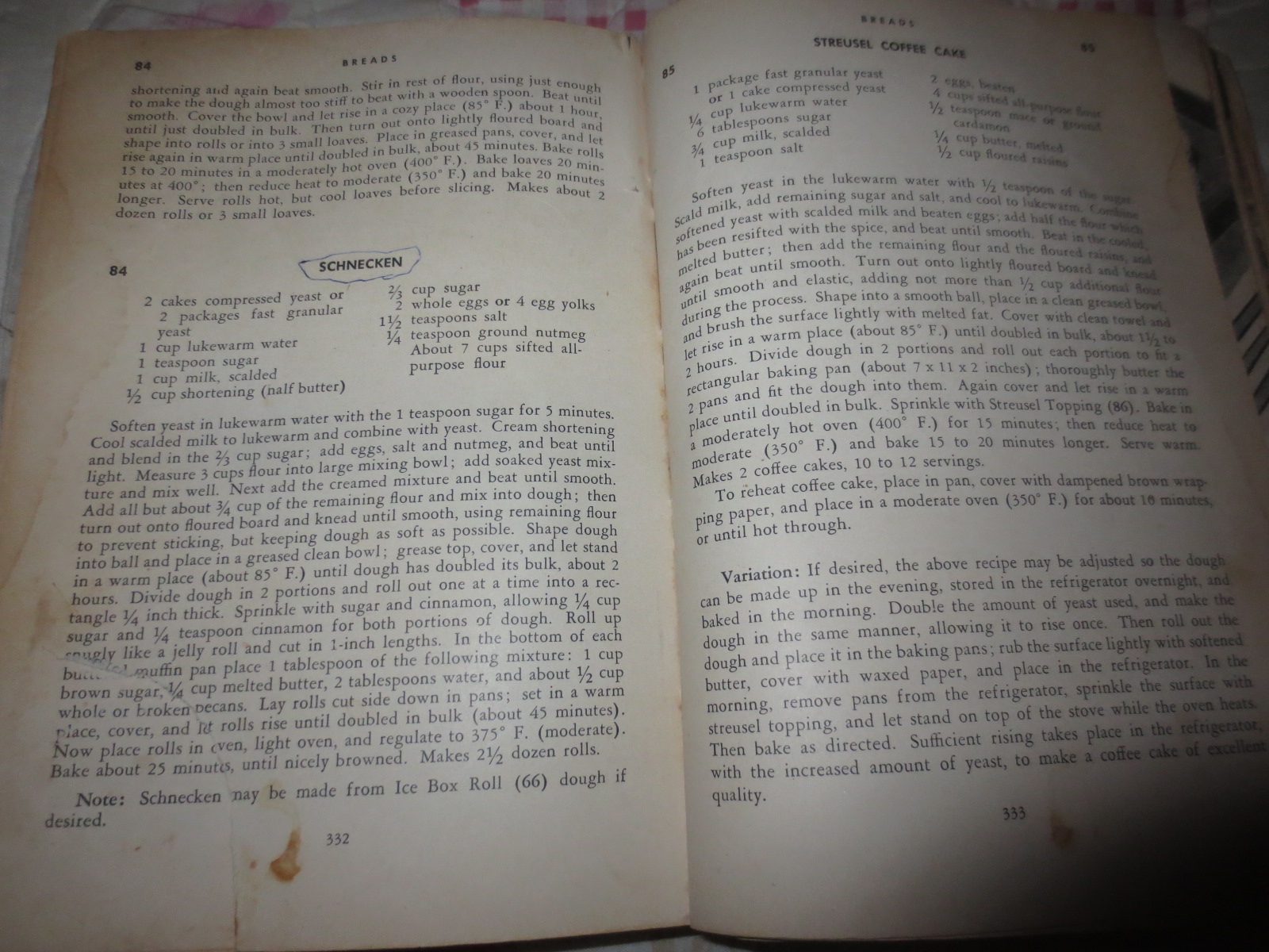 Tonight I turn to page 332 and find it marked with a bobby pin. My favorite bread of all time Schnecken!