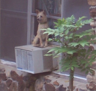 ha,ha - loved it, she is silly girl, pulling a stunt like that - how did she get up there, unless she jumped up on that small brick ledge, then on to the air conditioner and then was intimidated to jump back down. Safe in Mommas arms.