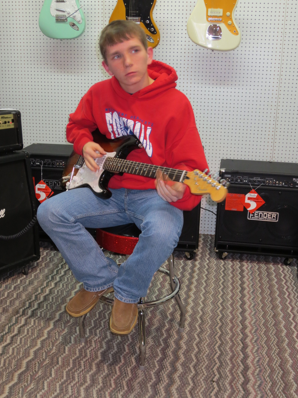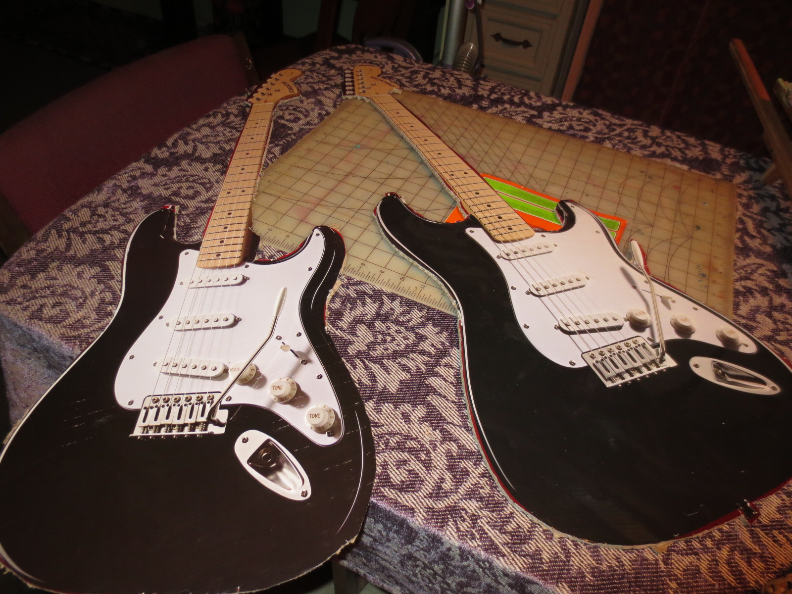 Returning from building fence Saturday the owner of this mess was met by one MAD grandmother. I found a fork in the floor! I guess you could say at least his guitar is on a rack but the other three and a banjo were leaned in a corner not even in their case.