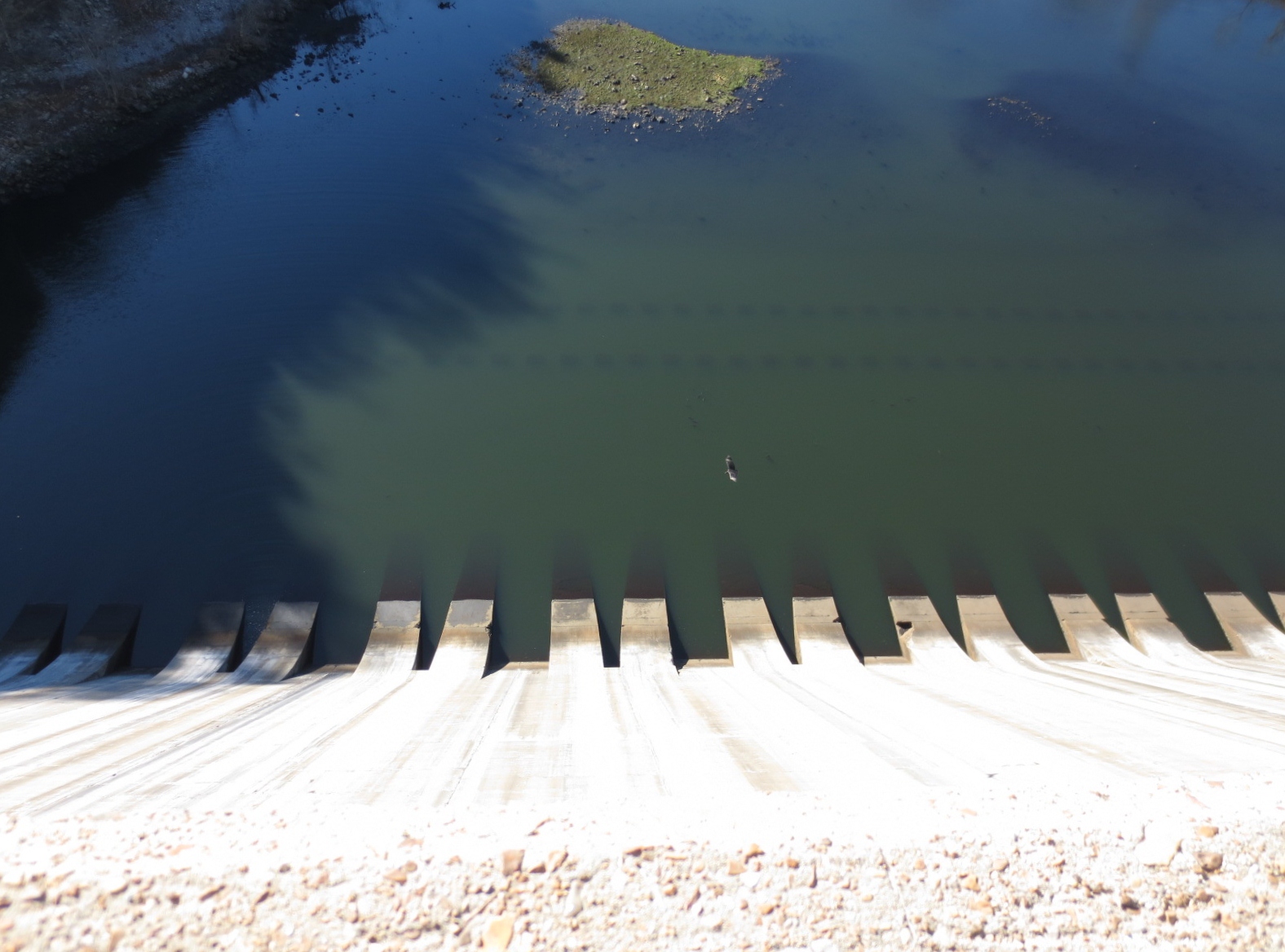 Not allowed to park on the dam, Hubby stopped the truck and said, Hurry! Take some pictures. No cars are coming. So I hoped out and shot. The dam was not generating power this day. The river looks green with algae.