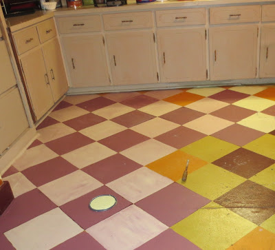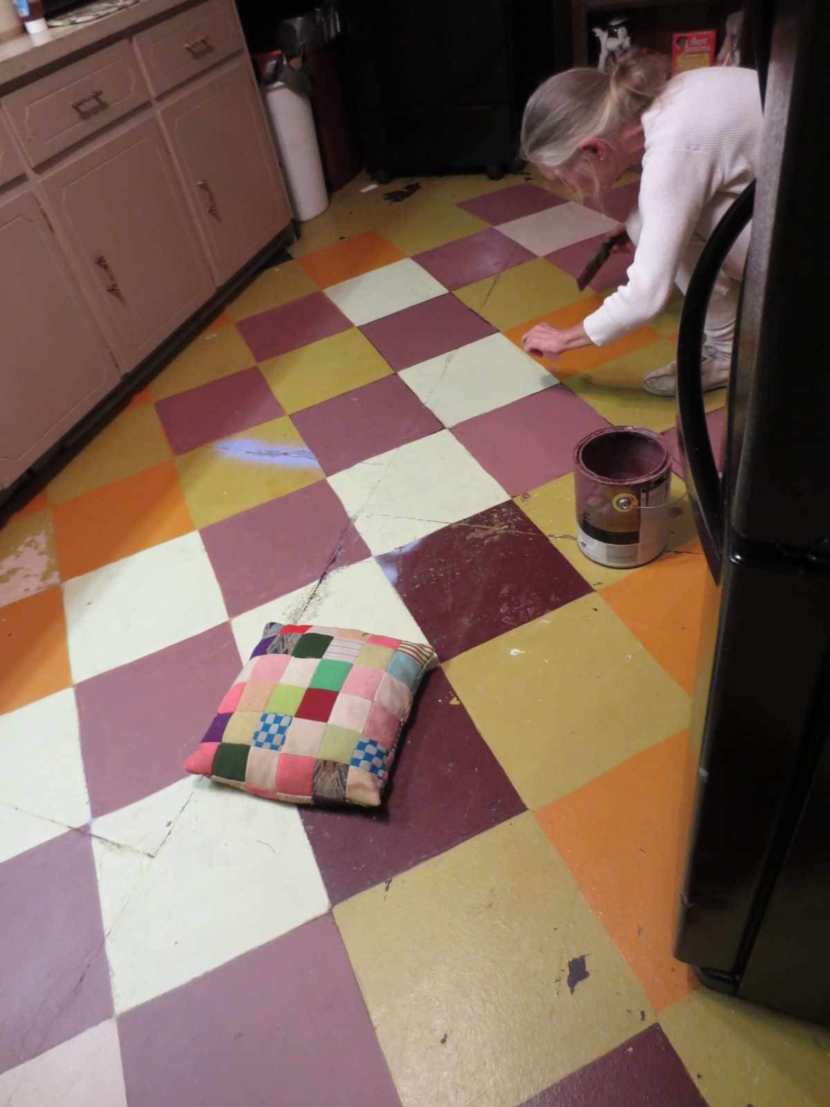 Twas a week before FebruaryThat my Sister snuck inAs still as a mouseWith an almighty grin.In two pails she had paint Of some brilliant coloursShe silently workedDidn't need no others -Knee prints on the cushionBut wait, there is moreOMG, what the heckhave you done to my floor???WANTED - ONE SISTER - POSSIBLY FROM ARKANSAS - LIGHT ON ER FEET- PAINTS KITCHEN FLOORS WITH DELIGHT - 55 CENT REWARDp.s. all fun aside, I think once its one, it'll look swell. Can I borrow your Sister for a while?