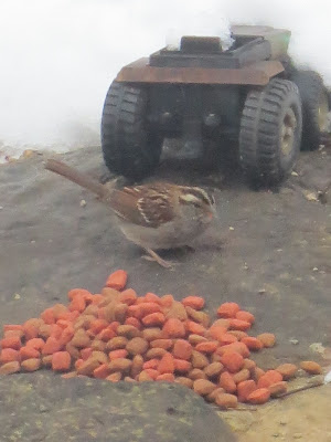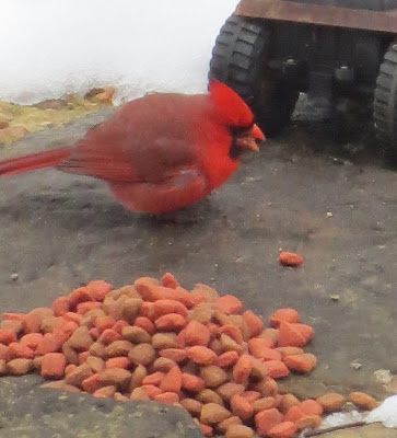 I did not know birds eat dog food.. love that little piggy cardinal... adorable. glad the snow is gone. we have a cold front coming to us for all of next week, this if Florida, so what is up with that?