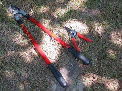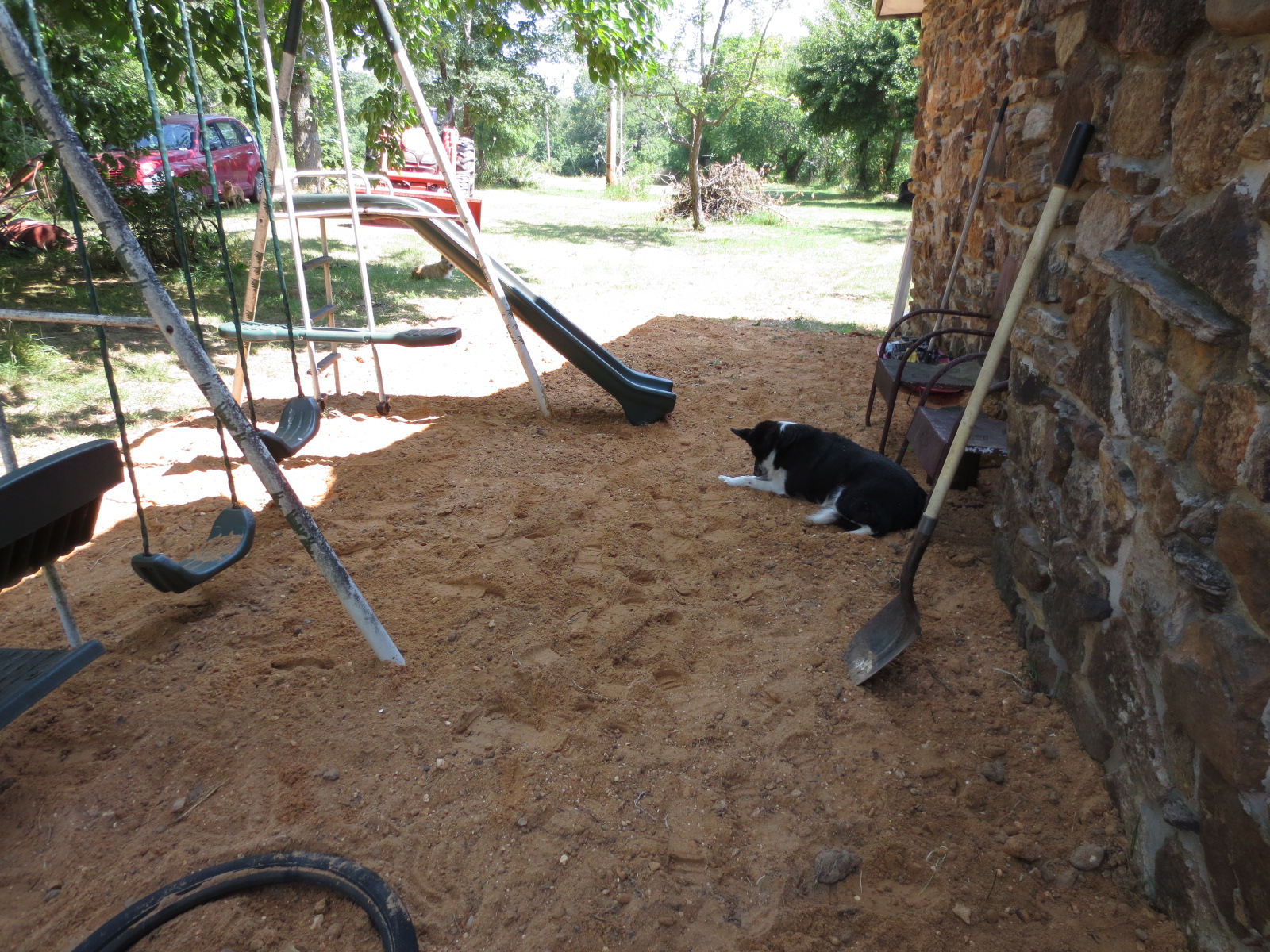 The set has been relocated in a mostly shady (except in this picture) with wonderful sand all around for lots of fun. Two chairs are provided for the convenience and comfort of adults required to be there.This is one Mulberry Tree behind the set and all the clipping that needs to be done. The lawn has been mowed all this time but the edges have been neglected.