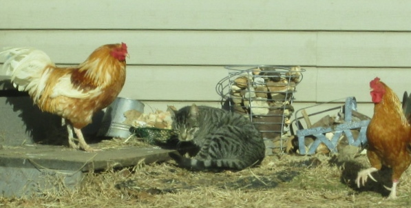 Looks like the cat and roosters found a warm place in the sun. :)