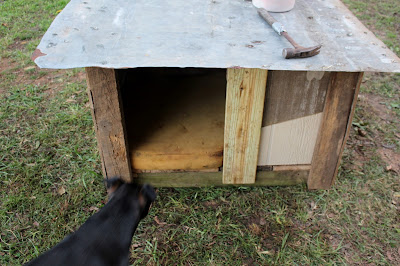 I love this one! And you even painted it and put a thick comfy cushion inside. Even dining on the roof! Men have their Man Caves, and they have their Doggie caves now. They will be so snug in the winter. I see they are all overseeing this project!