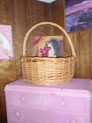 Let's see we have a pink dresser, a pink Charme, a dark seascape and a naked muppet in the basket with her behind hidden. Like I said, God love her, she likes my paintings and calls them art!