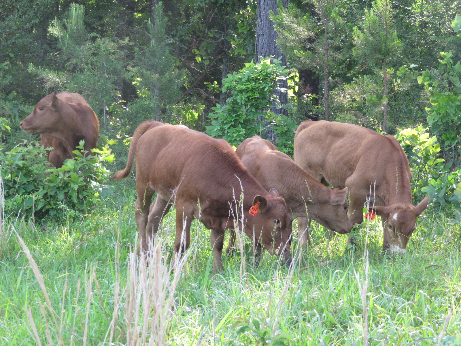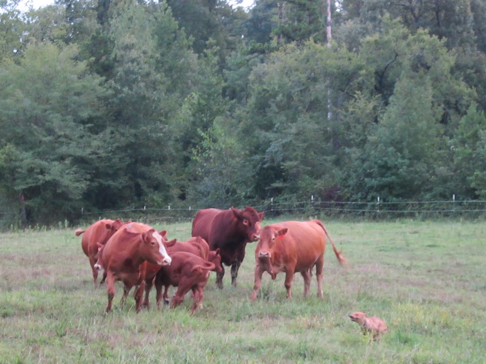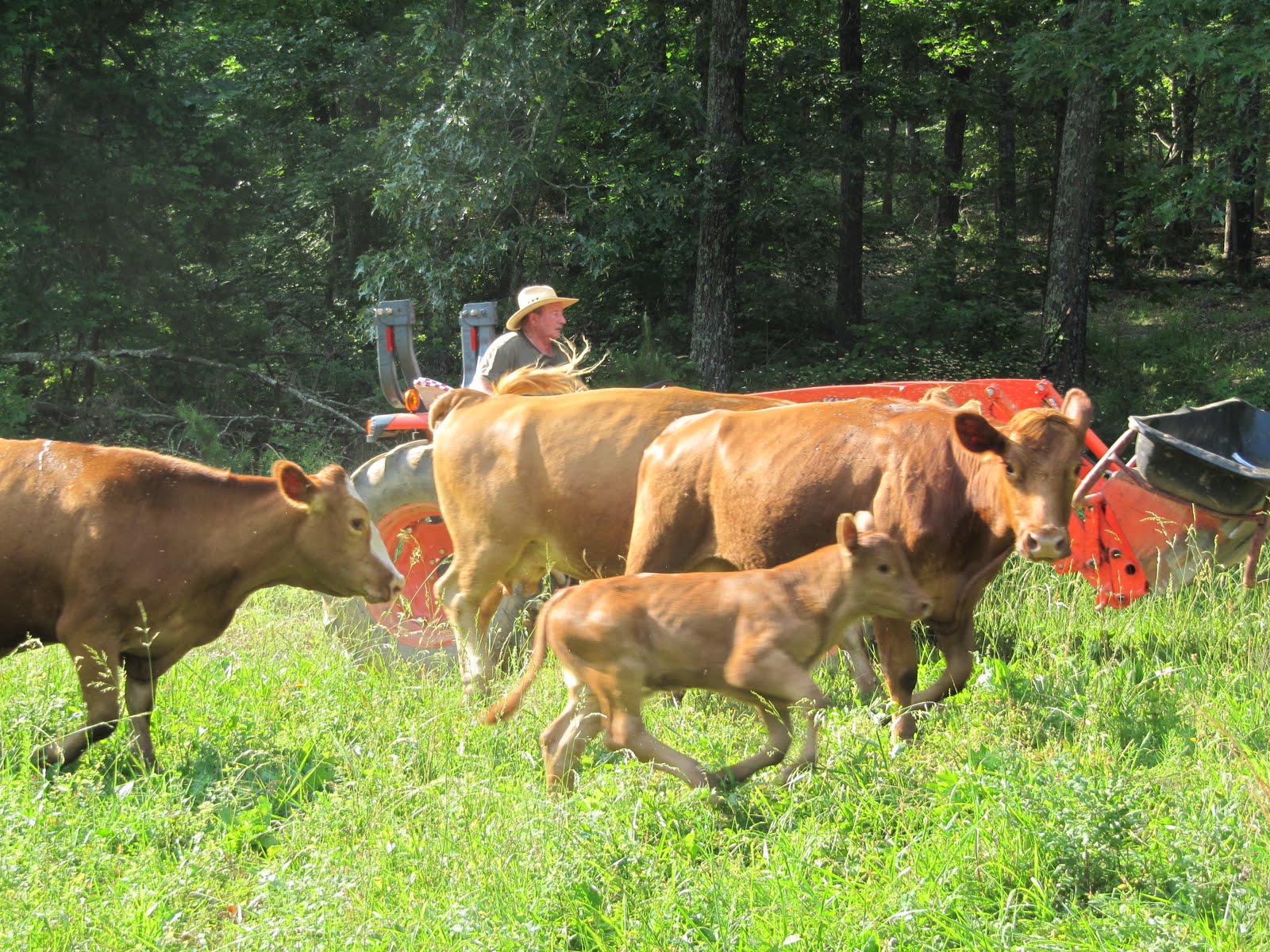 Since the older babies (around seven hundred pounds) went to sale Friday, we moved the rest of the herd to another pasture. With a sack of feed in the tractor bucket, I think hubby could lead these through town. Notice belly-butting bottle baby, Lovely, (front and center) is a strong member of the herd now.