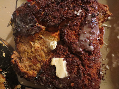 A sign of a good cook, I think, is the ability to make everyone think it is supposed to come out this way. Butter works to soften the outer crust of homemade bread so I tried that. Nope didn't work. So I carefully removed all the crusty pieces, cut them into small pieces and buried them in a bowl of cool whip. That worked, I have small soft DARK squares of cinnamony goodness.