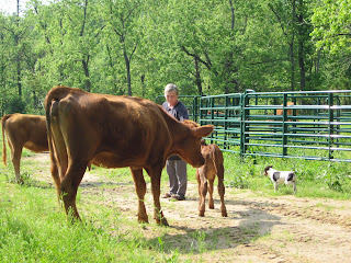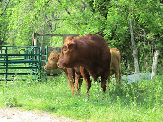 This is my favorite cow. She is huge and built perfectly in my book. Gelbvieh cattle come in three colors...yellow, red and black. I prefer the yellow, which is a "so last year" color. Hubby dreams of black. Now, tell me this...what difference does it make when all the meat is red after they are skinned? The funny thing is black brings more money at the sale barn...the least favorite is spotted cattle.