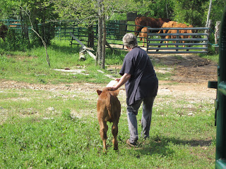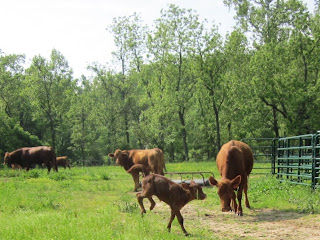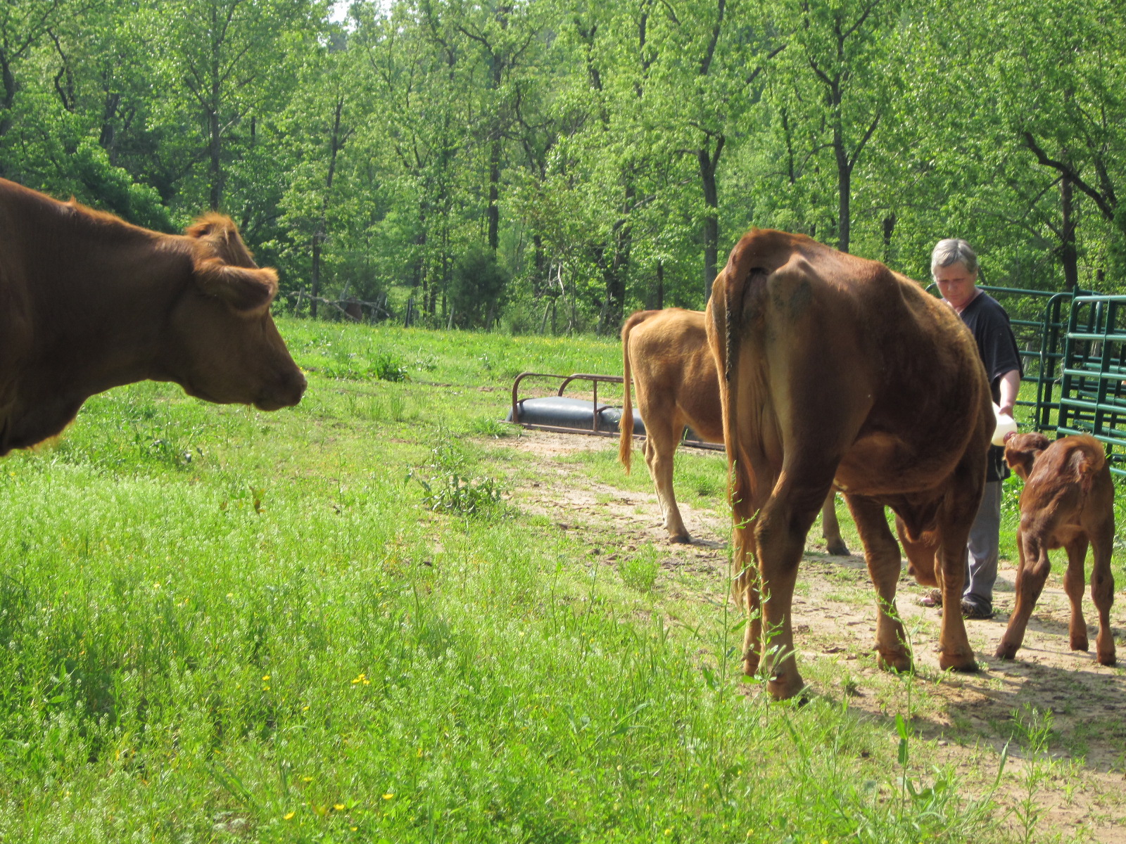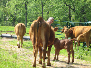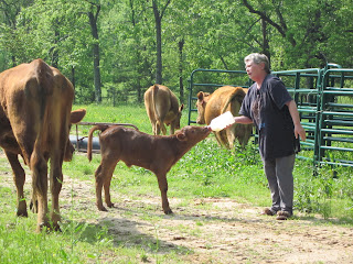 These are the early babies with Lovely in the middle, just like she was never a bottle baby. Lovely is about three months younger than her side mates. This was another miracle...Mom took Lovely back after she had been gone almost a month!!! Another reason Gelbveih are a wonderful choice of cattle. One mama will sit all the calves while the other mamas graze. If a babe becomes hungry, the nanny will feed it until the mother returns. Simply amazing to me!