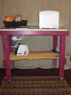 I was so thrilled to receive this wonderful gift.  I read and read and discovered every recipe called for dry milk.  I didn't have any at the moment so I worked on getting a table ready because the instructions said Do not operate on flammable surface.  Here is my knocked together unit that will hold the meat grinder and my bread machine while providing extra work space.  The top is an old enamel piece from a destroyed, not by me, Hoosier cabinet.  The bottom has rollers so I can move it anywhere.