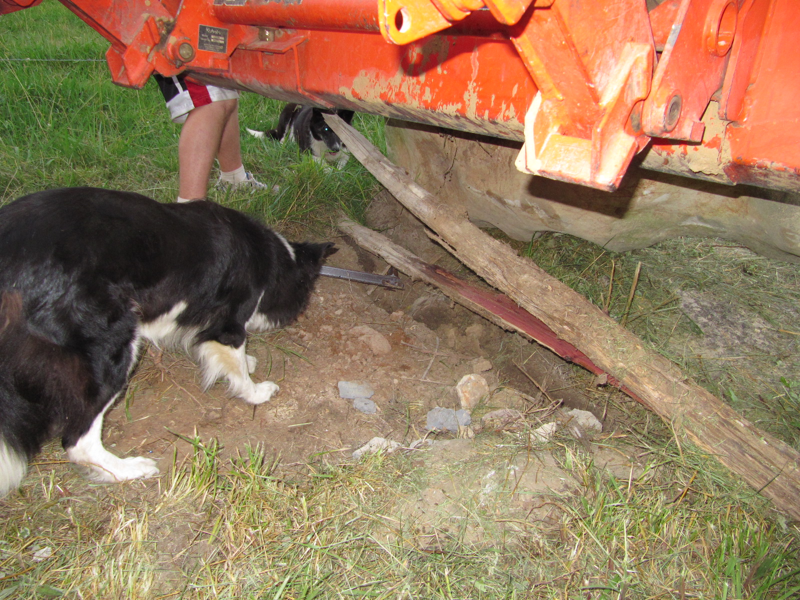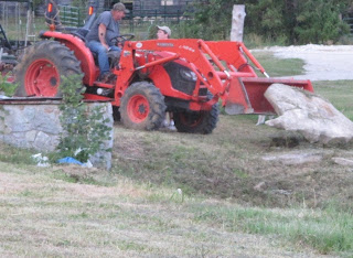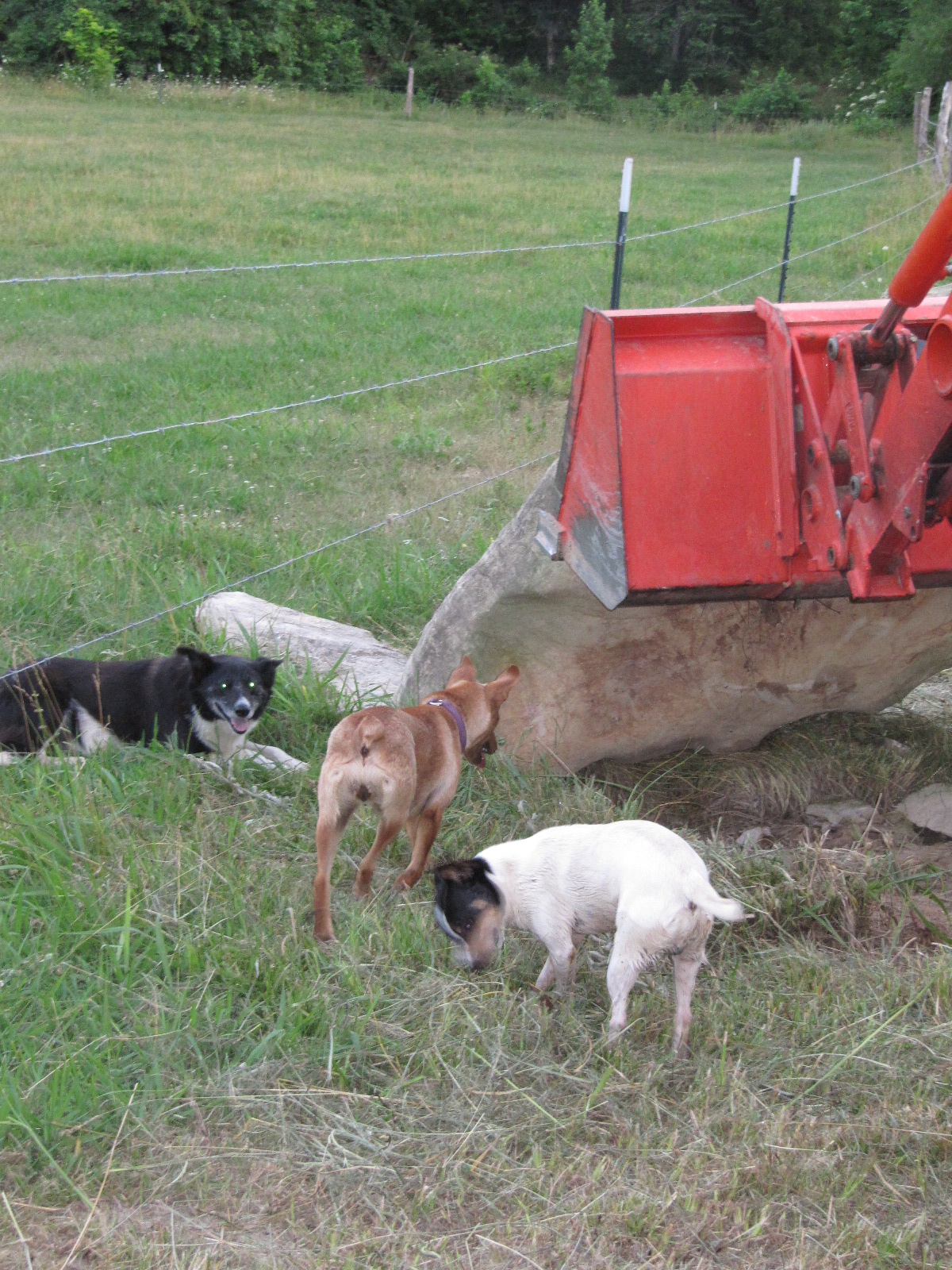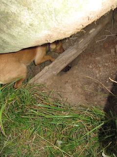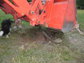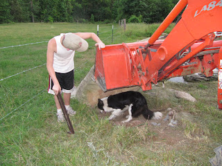 The rock was lowered safely in place with access to the hole.Now the dogs can seek the ball at their leisure. I am amazed at the energy and thought expended on the recovery of one tennis ball! I believe it has rolled to the center of the earth. Maybe the dogs will dig a storm shelter here or access a new spring...and this is what we do for fun At The Farm.