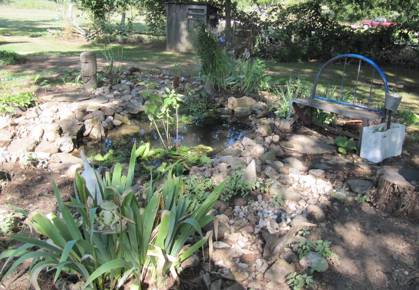 And, yes, that is a toilet tank by my bench.  I have planted House Leak in there.  I have washed rocks, waded knee deep with what I hoped was frogs bumping into my legs and have pulled every weed I could find.  It's through!!! My back was aching, my hands a wreck, my bare feet soaked and wrinkled but I'm done!!!!