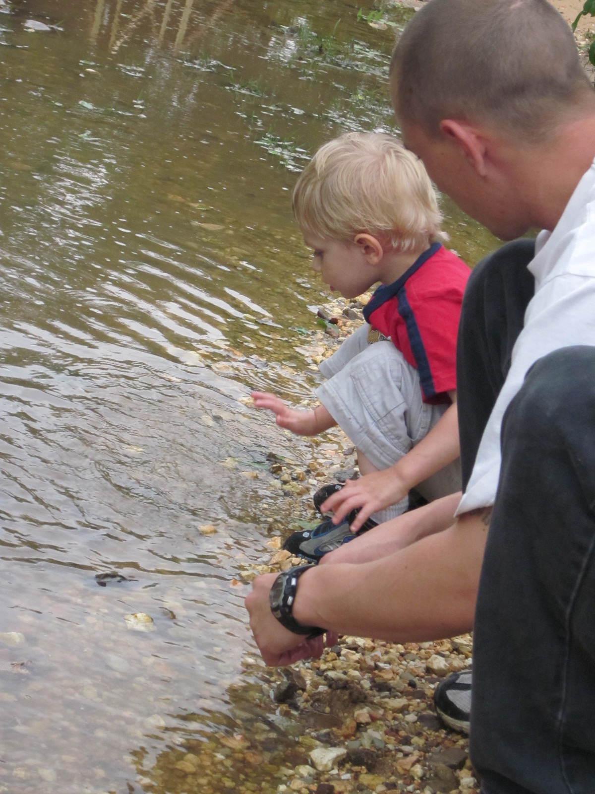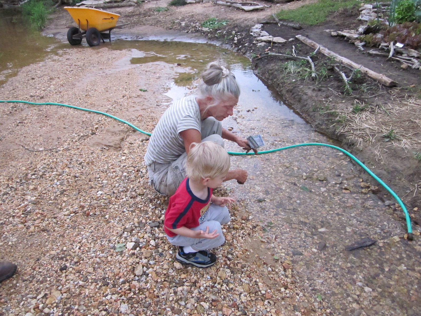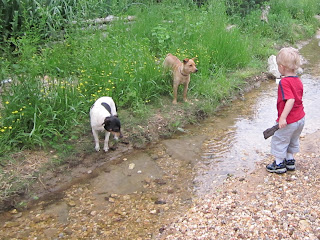 One of the wonderful things about the rain is flowing water and no shortage of sticks or bark to float. Zander is learning how a big piece of bark can be a boat and float down stream.