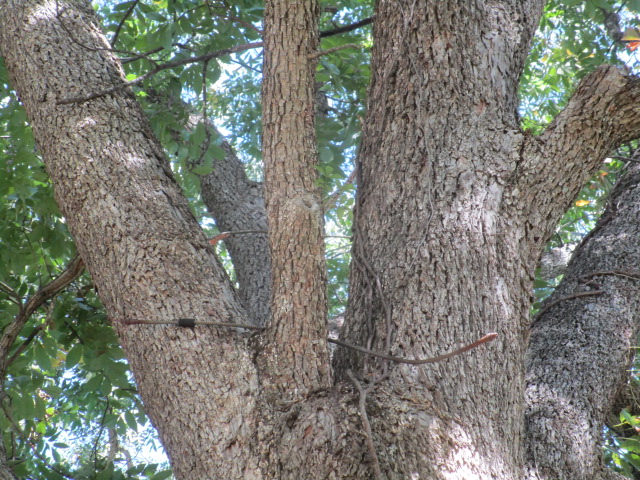 The tornado keeps on giving. This is one of the large pecan trees. About twenty feet off the ground we have found a brake cable, we think. The recent constant winds must have dislodged it and dropped it down where we could see.