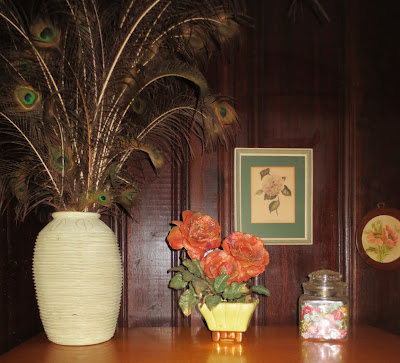 I like color, unique items, historical items and comfort. This is my stopping spot. Throw my purse on Granny's old chair from the drugstore/soda fountain closed umpteen years ago. Keys and loose things go in the tray on the small chest. Shoes stop here too. Notice my lime green flip flops, the trash I should have emptied and a concrete lawn statue named after a dear friend. I must decide how to hide that cord.