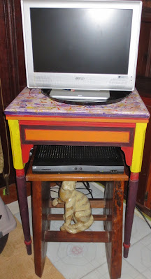 I enjoy repurposing items. This is a painted sewing machine table used for my tv stand and underneath is a black walnut table made by Dad.
