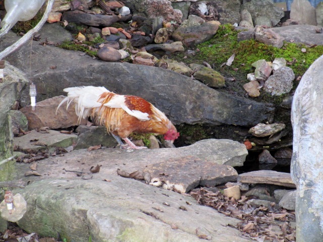 Things are looking up. Less poop on the porch and his crows echo around the water garden instead of off my bedroom window. RC still sleeps and eats with the dogs but I think he's remembered he is a rooster now.